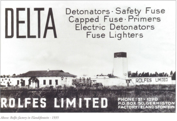 In 1928 he was joined by his brother, Dr Fritz Rolfes, and the company was relocated from Johannesburg to Germiston where the business was expanded to include the manufacturing of blasting accessories. In 1935 the company was relocated to it's present premises on a 150 acre site at Jet Park. At that time safety fuses had to be imported and Rolfes was instrumental in establishing a local manufacturing industry with its associates and partners.